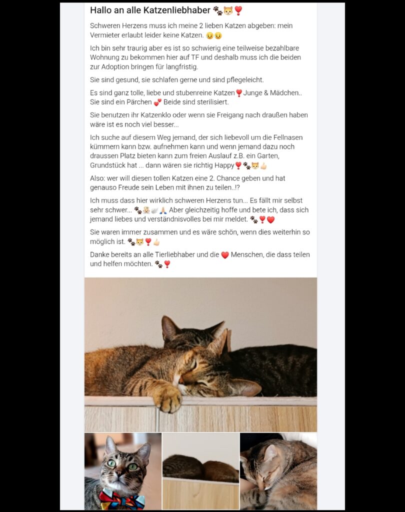 Schweren Herzens muss ich meine 2 lieben Katzen abgeben: mein Vermieter erlaubt leider keine Katzen.😥