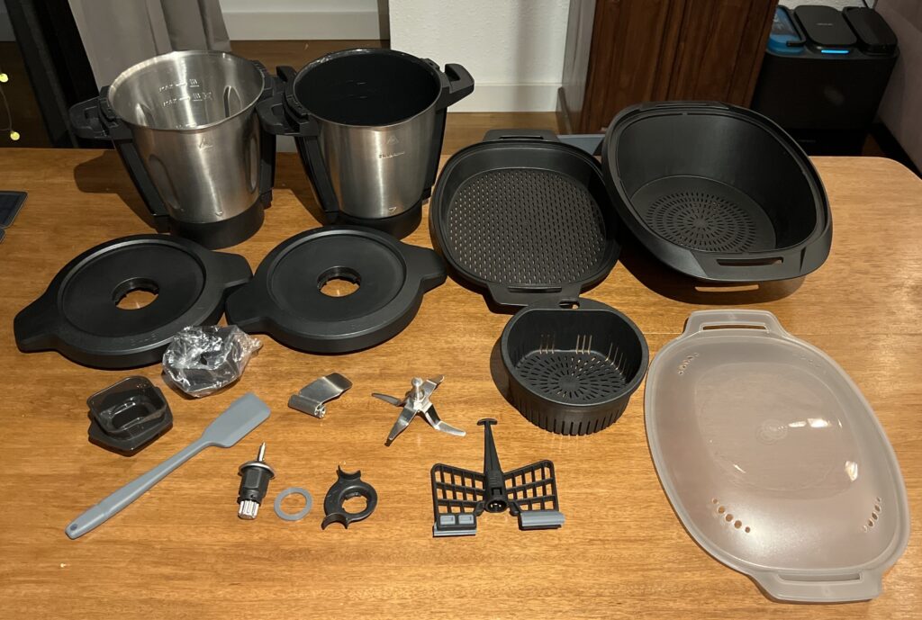 2× Mixbehälter, 2× Deckel, Messer, Teigaufsatz, Rühraufsatz (Schmetterling), Spatel, Dampfgaraufsatz, Dampfgar-Korb, zusätzlicher Einsatzkorb, 2× Messbecher, Kleinteile/Dichtungen, Aufbewahrungsdeckel.