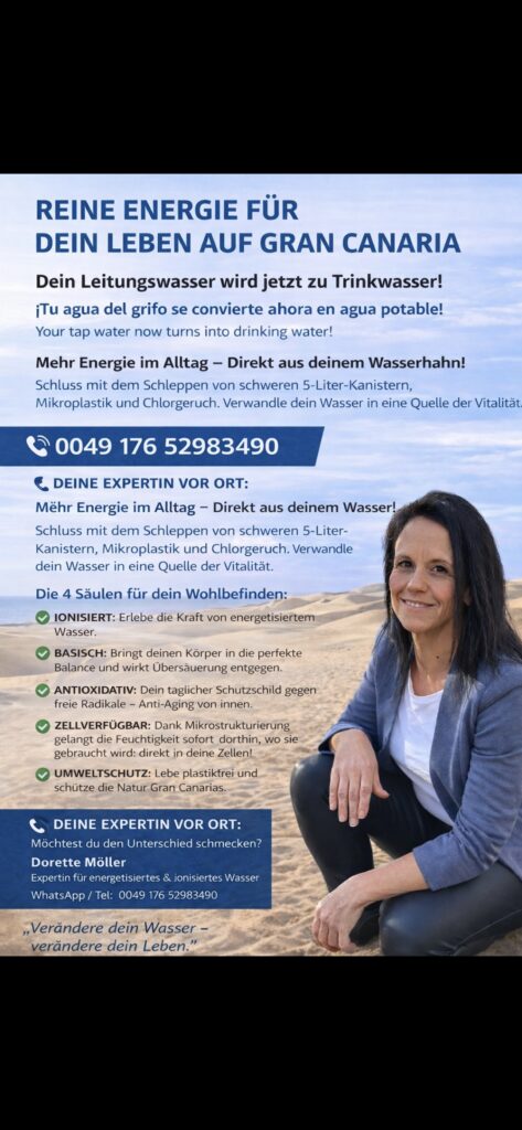 💧 Stell dir vor, dein Wasser fühlt sich plötzlich anders an – weicher, klarer, lebendiger. Viele Menschen spüren diesen Unterschied schon beim ersten Schluck. Es ist mehr als Trinken – es ist ein neues Gefühl im Alltag. Direkt hier auf Gran Canaria. Kostenlos testen und selbst erleben.