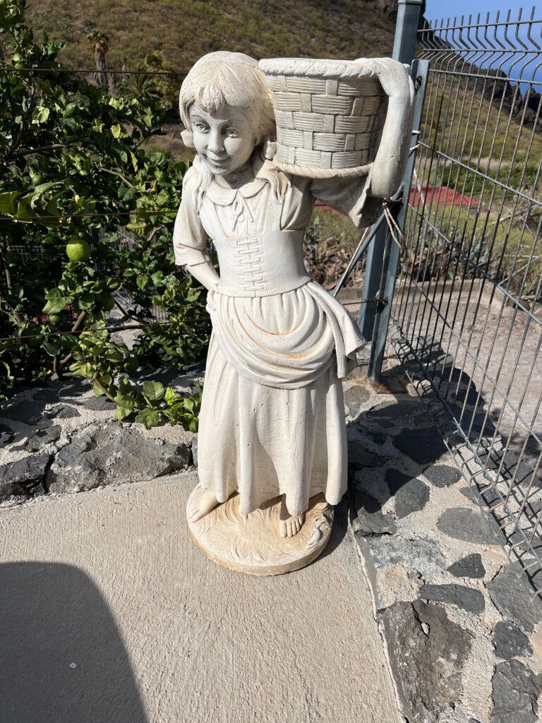 Die Skulptur ist gut in Schuss und ca 1,20m hoch und aus Stein. In dem Korb kann ein Blumentopf stehen.
